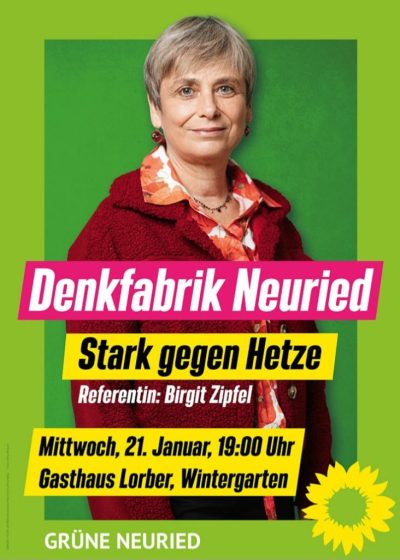 Die Grünen Neuried laden am 21.01.2026 um 19.00 Uhr zur ihrer nächsten Denkfabrik in das Gasthaus Lorber (Wintergarten) ein. Die ausgebildete Mediatorin Birgit Zipfel, Mitglied der GRÜNEN-Fraktion im Neurieder Gemeiderat, stellt einfache Strategien vor, wie man Hass und Hetze in die Schranken weist und cool und dennoch klar auf sogenannte Stammtischparolen reagiert