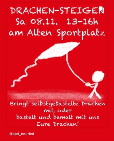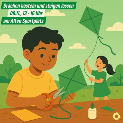 Herbstwind! Kommt zum Drachen steigen lassen. Ihr könnt euren eigenen mitbringen oder einen basteln. Das Material dafür bringen wir mit. Wir treffen uns am Samstag, 8. November um 13 Uhr beim alten Sportplatz, neben dem Kinderhaus an der Zugspitzstraße.